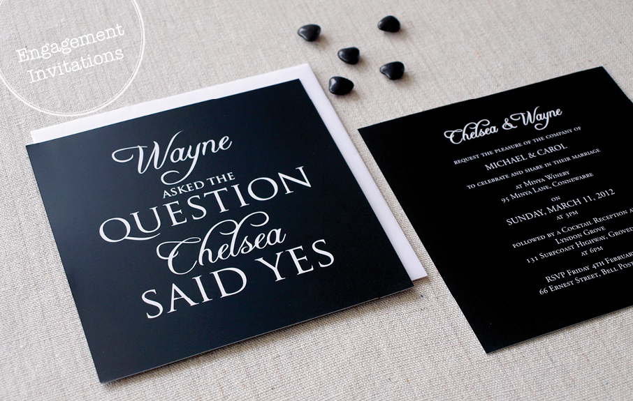 Congratulations! We are assuming that you are engaged if you’re browsing in this section! We are proud to offer this stylish collection of designer Engagement Invitations. We can also provide other matching items such as rsvp cards, thank you cards, place cards etc. Please browse in our wedding invitation and stationery section for viewing and purchasing these items. We also have a range of divine wedding logos that adds the perfect personalised touch to your special day! We can alter any of our wedding invitation designs for an engagement invitation, just contact us for details. For engagement invitation wording ideas visit our Wording Guides. Happy planning!